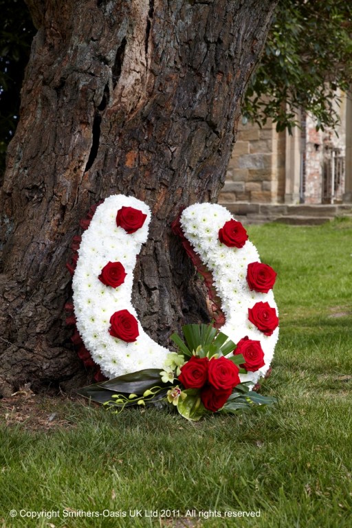 This classic horseshoe design is a fitting tribute for a loved on who loved horses of course. The design is based in white crysanthemum with your choice of rose colour placed throughout the design with a complimenting rose spray at the bottom of the design. The horshoe is the surrounded by pleated ribbon in complimenting colours to the roses. The horseshoe frame is 13" in size.