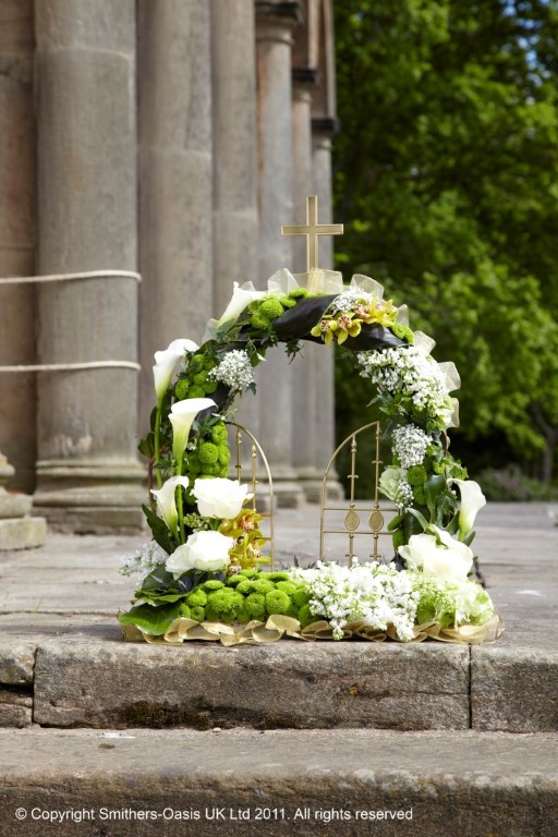 This beautiful contempary design emulates the pearly gates of heaven. The design consists of clustered bunches of stylish flowers that flow around the shape of the design in your choice of colour. Our florist will pick the best flowers in seaon and most appropriate. The image shown shows flowers such as calla lily, rose, hydrangea and orchid combined with florist choice foliage.