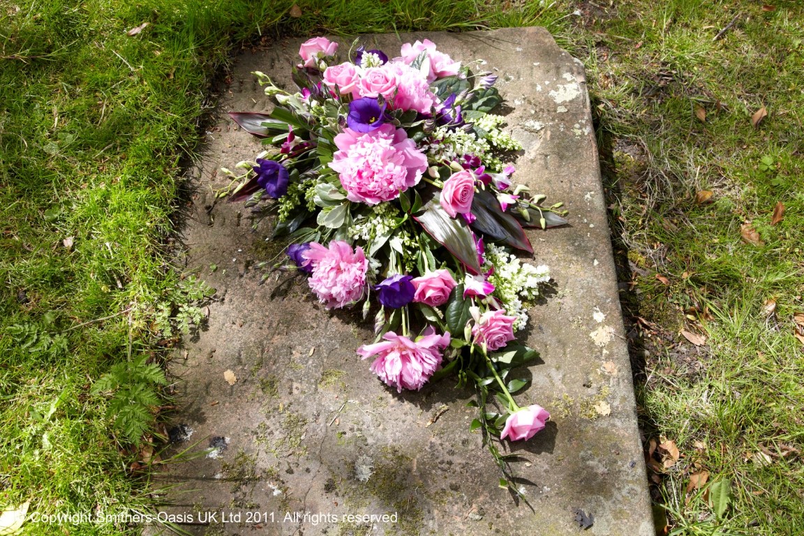 A traditional single ended teardrop spray consisting of a mix of florist choice foliage and flowers in pinks with a touch of deeper purple to create a lovely, balanced design. Due to the seasonal availbility of the peony (shown in the image) -Our florists will substitue with only the most top grade flowers in accordance with the season. Design is approx. 65cm by 40cm