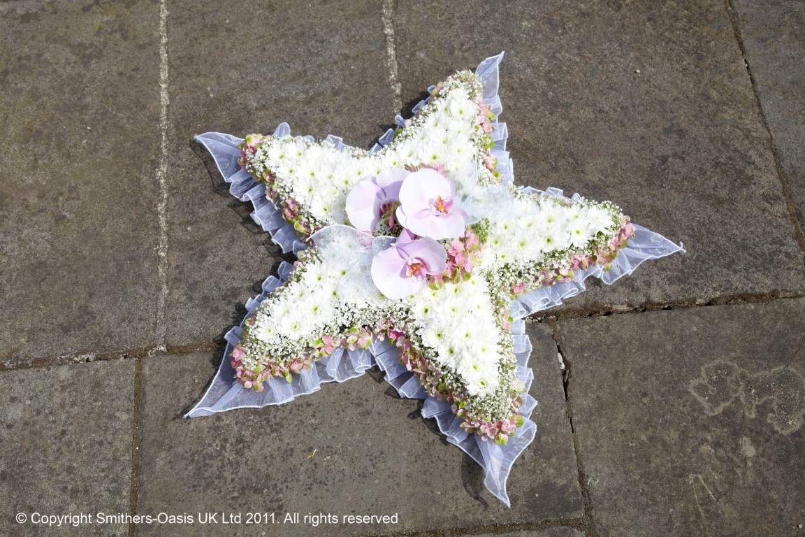 This delicate star tribute is perfect for a loved one. The design is based in white cyrsanthemum with your choice of spray in the middle of the design. The star is then surrounded by ribbon in a complimenting choice of colour to the spray. This piece is a perfect addition to other designs for a funeral.
