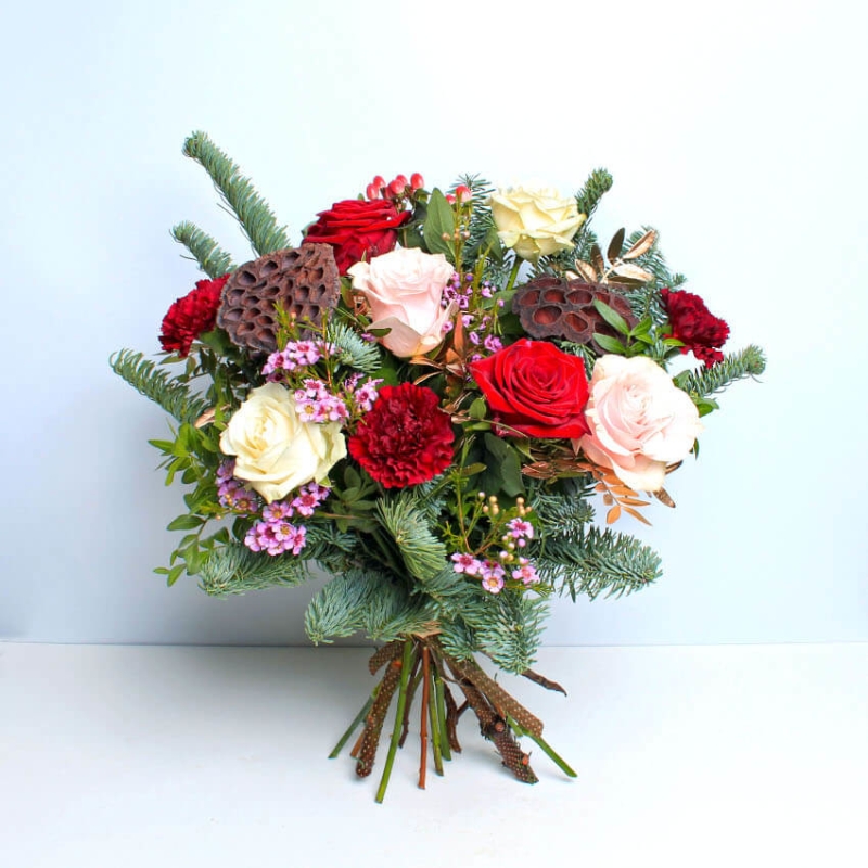 Our Luxury Christmas Handtied is a great choice to be on your list of gifts to send to loved ones. Our Luxury Bouquet combines gorgeous mixed roses in festive colours with winter foliage and dried lotus pods.