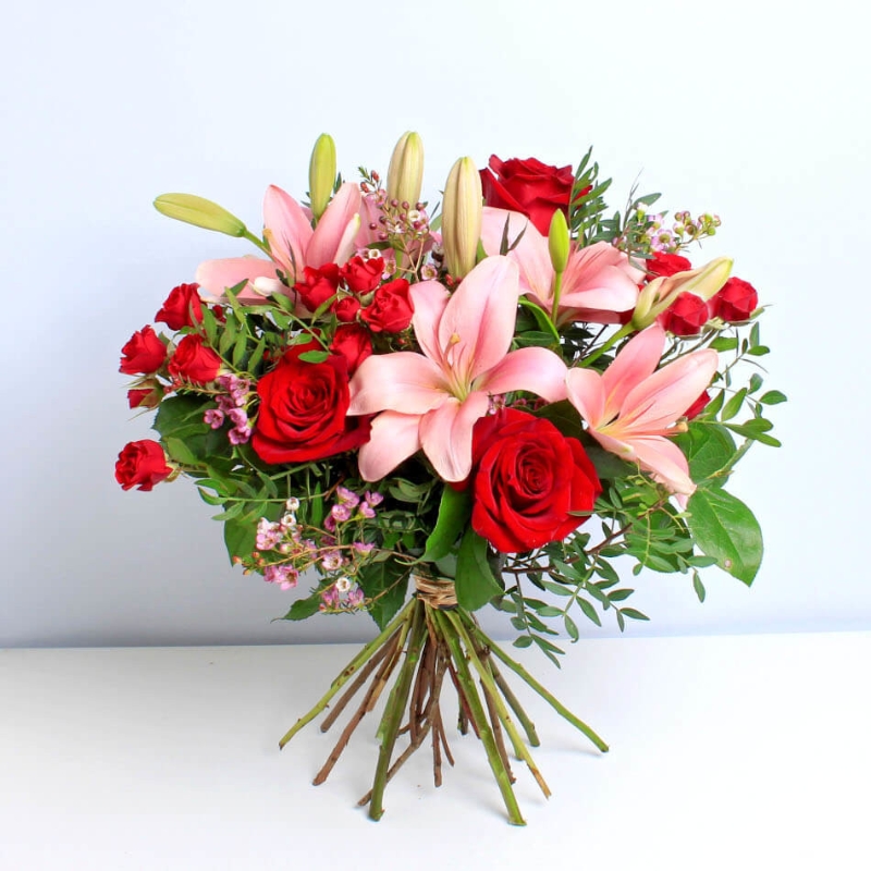 Strawberry flower bouquet surprise your loved ones with a perfect combination of red roses and pink lilies. This elegant display can shiver the heart of your beloved.