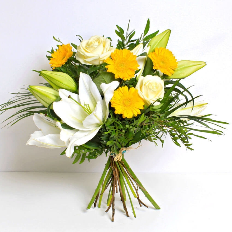 The Azura flower bouquet is a mix of gorgeous golden and white flowers.. This pretty design of flowers can bring a cheer to anyone.